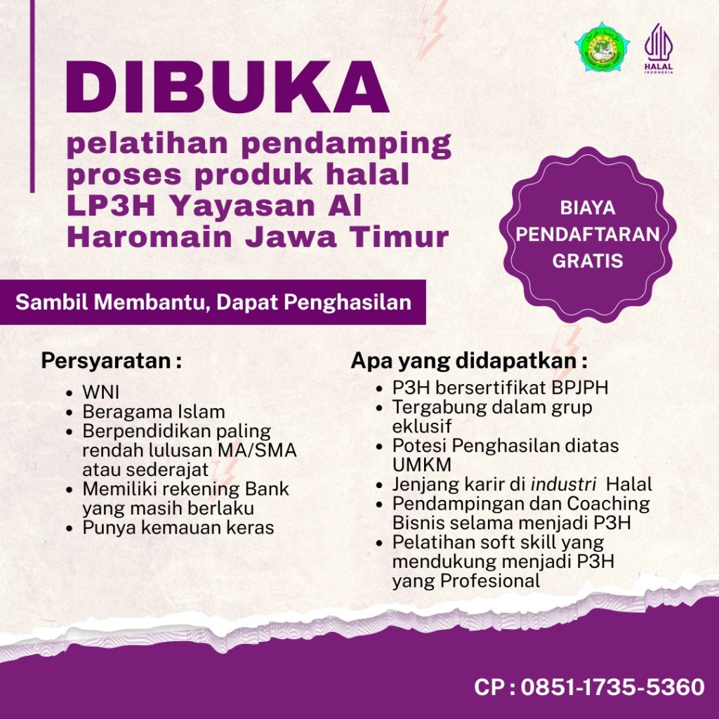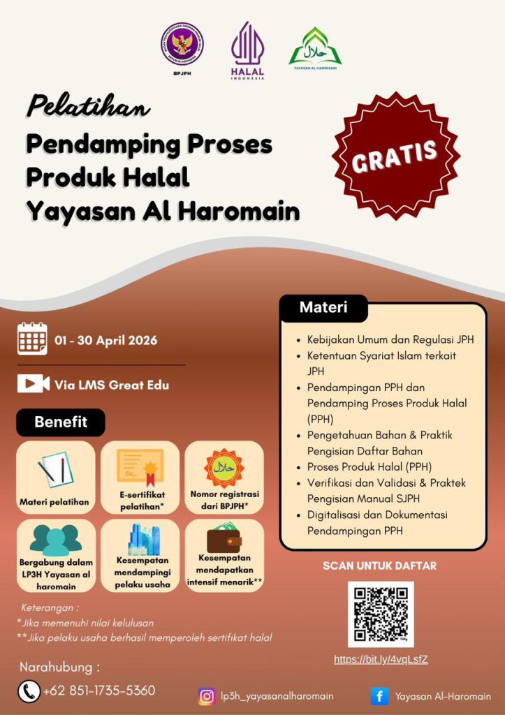 LP3H Yayasan Al-Haromain berkomitmen untuk mendampingi pelaku usaha dalam proses sertifikasi halal. Dengan izin resmi dari BPJPH, kami menyediakan layanan berkualitas untuk memastikan produk Anda mendapatkan sertifikat halal. Selain itu, kami juga membuka rekrutmen tenaga pendamping dengan insentif mulai dari 3jt rupiah.